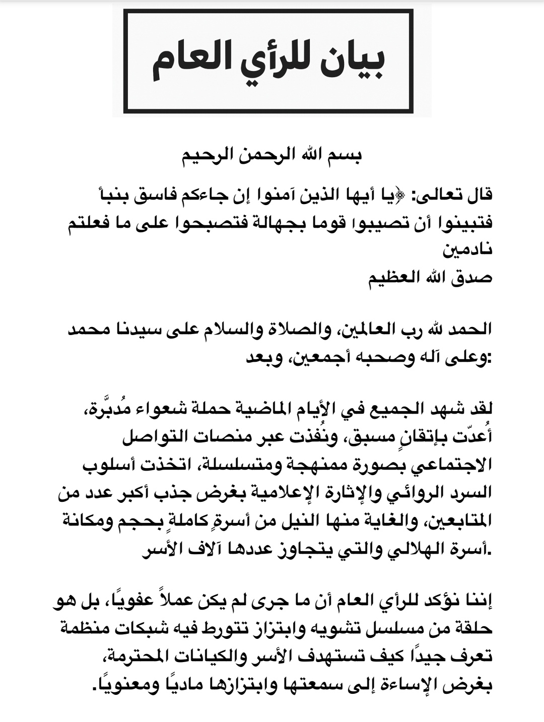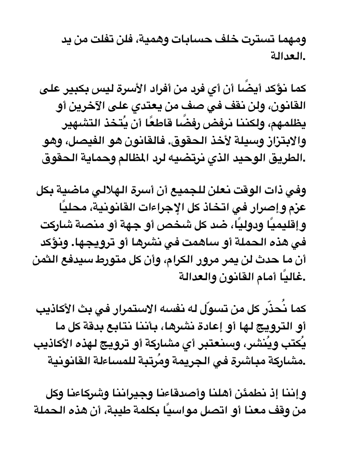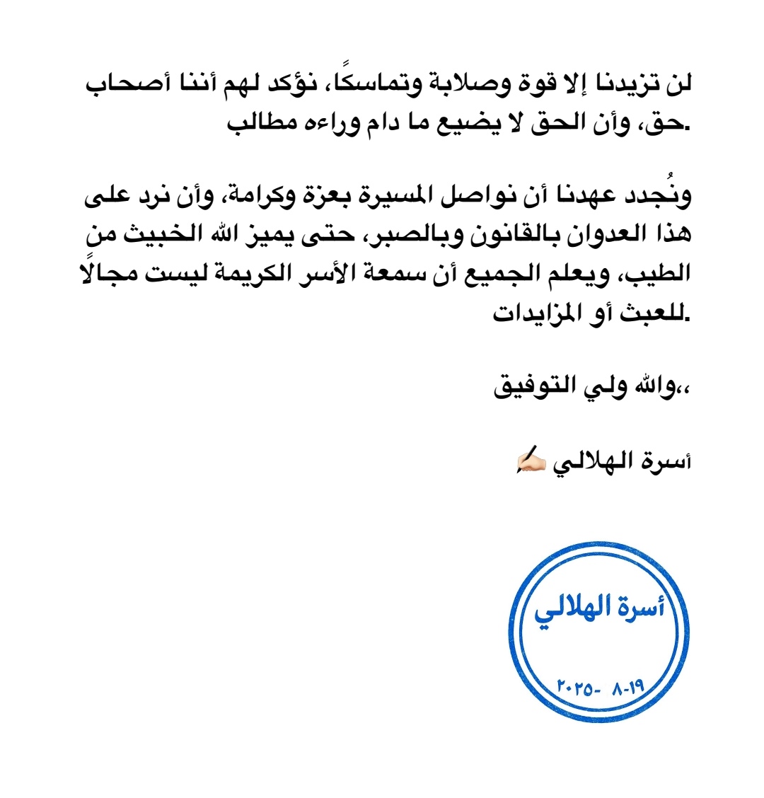 بيان من أسرة الهلالي تحذر من تسول له نفسه الاستمرار في بث الاكاذيب وتتوعد المشاركين والمروجين باتخاذ الإجراءات القانونية