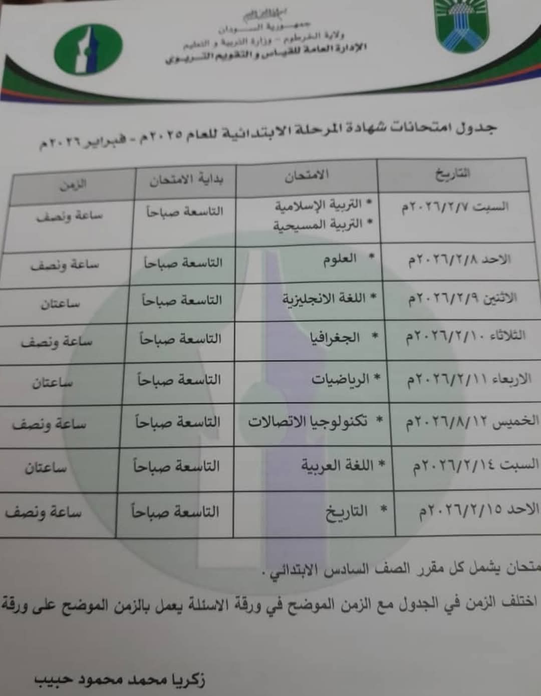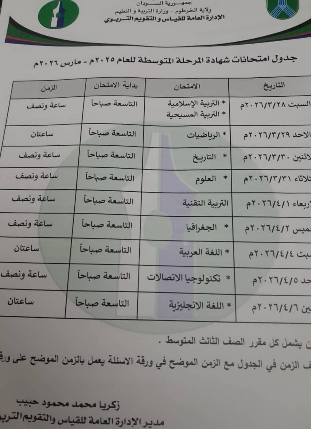 أصدرت جدول امتحانات الشهادتين الابتدائية والمتوسطة.. الخرطوم تجيز التقويم المدرسي للعام الدراسي ٢٠٢٥م -٢٠٢٦م